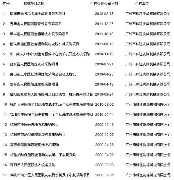 据广东省政府采购网(www.gdgpo.gov.cn/)所有公布的中标信息统计,自2008年1月1日起截止至2012年2月23日,广东省各级政府单位组织的洗涤设备招标活动共计48次,米兰体育以35.41%的中标率(17次中标)在所有17个中标单位中连续五年排名第一,比第二名的14.58%(7次中标)高出一倍多,充分体现了珠江牌洗涤设备大幅领先同行的综合性价比优势